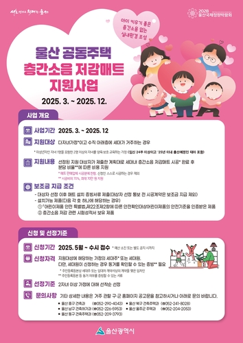 울산시가 공동주택 용도 제한 확대 및 2자녀 이상 요건 산정 시 태아도 자녀 수 포함 등 '공동주택 층간소음 저감매트 지원사업' 수혜 대상 확대에 나선다.