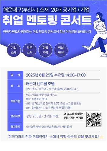 해운대와 부산시에 있는 공기업, 중견기업 현직자 20명이 멘토로 참여해 지역 청년들에게 최신 채용 추세를 소개하고 취업 경쟁력 제고를 위한 생생한 조언을 전달할 예정이다.