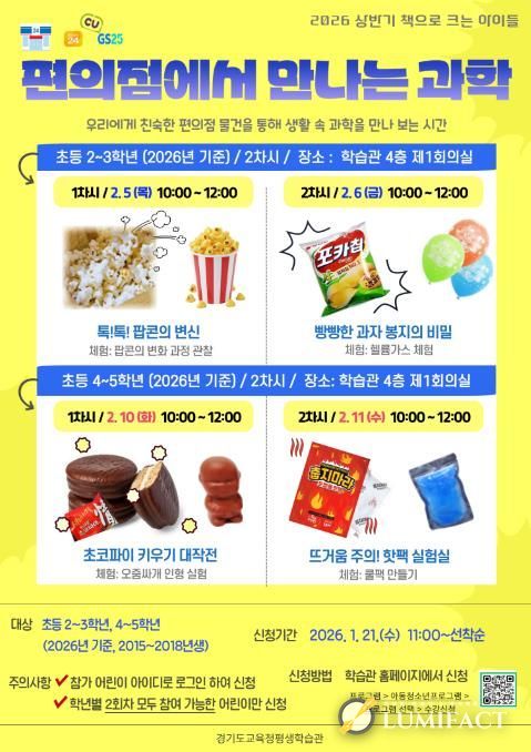 2월 5일부터 11일까지 운영되는 이번 프로그램은 어린이들이 일상에서 쉽게 접하는 편의점 물건을 통해 과학적 사고력과 탐구 능력을 키우고 즐거운 학습 경험을 제공하고자 마련됐다.