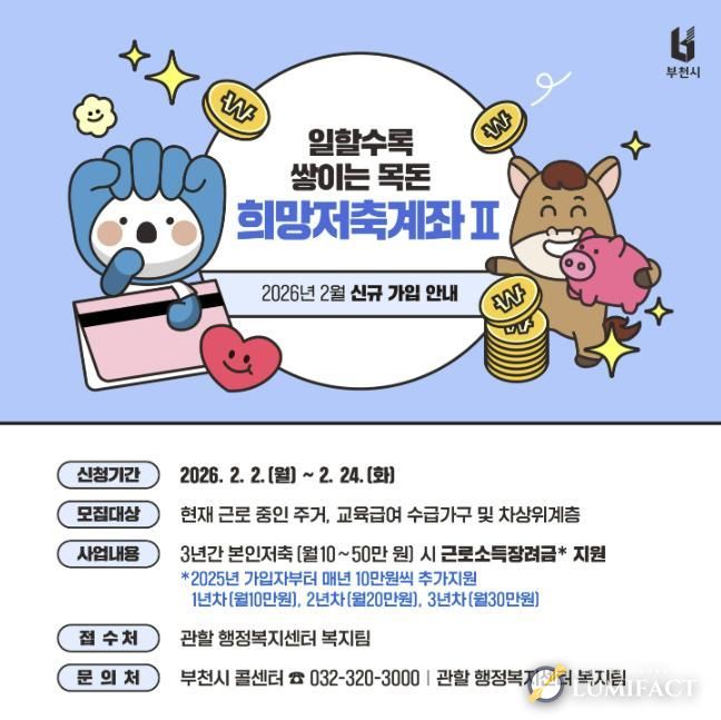 루미팩트 이아린 기자 | 부천시는 근로 중인 주거․ 교육급여 수급 가구와 차상위계층의 자산 형성과 자립을 지원하기 위해 ‘2026년 희망저축계좌(Ⅱ)’ 신규 가입자를 오는 2월 2일부터 24일까지 모집한다고 30일 밝혔다.