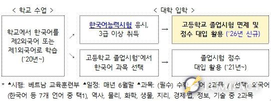 베트남 대입제도는 우리나라의 대학수학능력시험에 해당하는 전국 단위 시험인 ‘고등학교 졸업시험’을 중심으로 운영된다. 베트남 학생들은 졸업시험 과목 중 수학과 국어(베트남어)는 필수로 응시하고, 외국어·역사 등 9개 과목 중 2개를 선택해 총 4개 과목에 응시한다. 이번 결정은 한국어능력시험 성적으로 졸업시험 외국어 과목을 대체할 수 있다는 내용이다. 즉, 한국어능력시험에서 토픽(TOPIK) 3급 이상 취득한 학생은 졸업시험 선택과목 1개를 면제받고 환산된 한국어능력시험 점수를 졸업시험 성적으로 인정받을 수 있다.