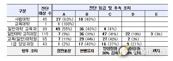 이번 진단 결과에 따라 해당 기관의 2027학년도 교원양성정원이 조정된다. 진단 결과 씨(C) 등급 기관은 정원의 30% 감축, 디(D) 등급 기관은 정원의 50%가 감축되며, 이(E) 등급 기관은 교원양성기능이 폐지될 예정이다.