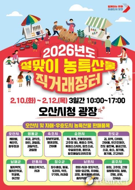 루미팩트 이아린 기자 | 오산시는 설 명절을 맞아 오는 2월 10일부터 12일까지 3일간, 오전 10시부터 오후 5시까지 오산시청 광장에서 자매·우호도시와 함께하는 ‘설맞이 농특산물 직거래장터’를 개최한다고 밝혔다.