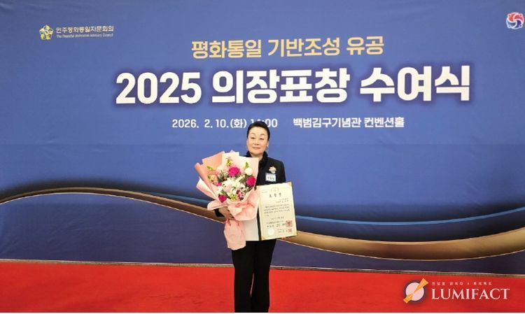 루미팩트 백라희 기자 | 정임행 민주평화통일자문회의 강남구협의회 차석(㈜파모소 회장)이 2026년 2월 10일 오후 2시 서울 용산구 백범김구기념관 컨벤션홀에서 개최된 민주평화통일자문회의 2025 의장표창 수여식(서울지역)에서 민주평화통일자문회의 의장 대통령 표창을 수상했다.