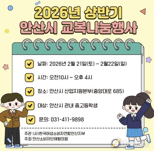 루미팩트 이아린 기자 | 안산시는 오는 21일부터 22일까지 이틀간 산업지원본부 내 교복상설매장에서 ‘상반기 중·고생 교복 나눔 행사’를 개최한다고 19일 밝혔다.