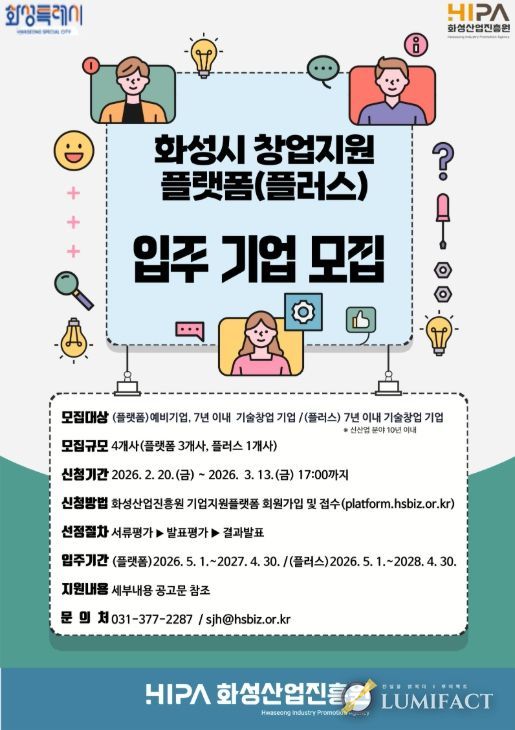 루미팩트 백라희 기자 | 화성산업진흥원(원장 전병선)은 동탄2 인큐베이팅센터 내 창업보육센터 ‘창업지원플랫폼’과‘창업지원플랫폼 플러스’ 입주기업을 오는 3월 13일까지 모집한다고 밝혔다.