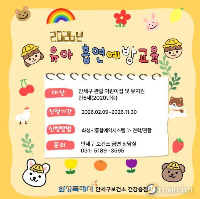 루미팩트 이아린 기자 | 화성특례시 만세구보건소는 관내 유치원과 어린이집 만 5세 유아를 대상으로 올해 3월부터 11월까지 흡연 예방 교육을 운영한다고 밝혔다.