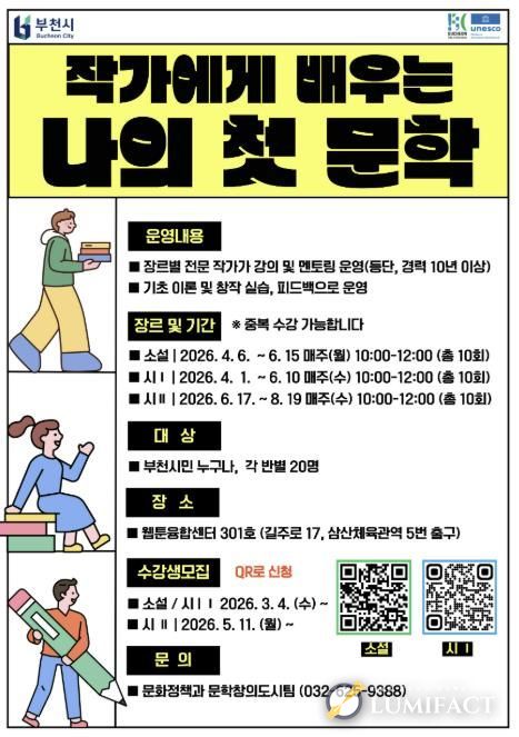 교육은 웹툰융합센터 301호에서 진행되며, 부천시민을 대상으로 반별 20명을 선착순 모집한다. 1기 소설과 시 과정 신청은 3월 9일부터, 2기 시 과정 신청은 5월 11일부터다.