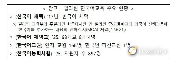 필리핀은 2017년에 현지 정규 교육과정의 외국어 과목으로 한국어를 정식 채택하는 것으로 결정하고, 2018년부터 한국어반을 운영해 왔다. 현재는 90여 개 학교에서 8,000여 명의 학생들이 한국어를 배우고 있다. 이번 양해각서는 한국 교육부가 필리핀 내 한국어 교사들을 위한 집중 연수 과정을 지원하여, 한국어교육 전문성을 높이도록 하는 내용이 핵심이다.