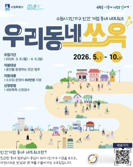 수원시 관계자는 “우리동네 쏘옥은 시민들이 자주 찾는 동네 공간을 소통 거점으로 활용해 1인가구가 자연스럽게 관계를 이어갈 수 있도록 돕는 사업”이라며 “민간 공간 운영자들의 많은 관심과 참여를 바란다”고 말했다.