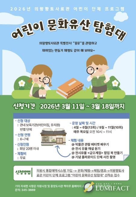루미팩트 이아린 기자 | 의왕시 향토사료관이 오는 4월부터 6월, 9월부터 10월 매주 목요일에 어린이 단체 체험프로그램 ‘어린이 문화유산 탐험대’를 운영한다.