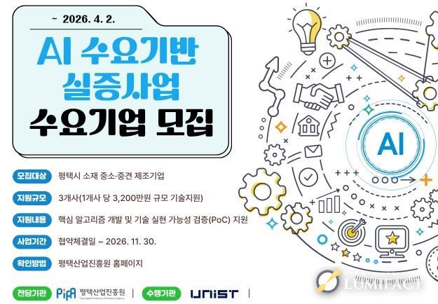 이번 ‘AI 수요기반 실증사업’의 상세 공고 내용과 신청 양식은 평택산업진흥원 누리집 및 평택기업지원시스템에서 확인할 수 있으며, 신청 접수는 4월 2일까지 진행된다.