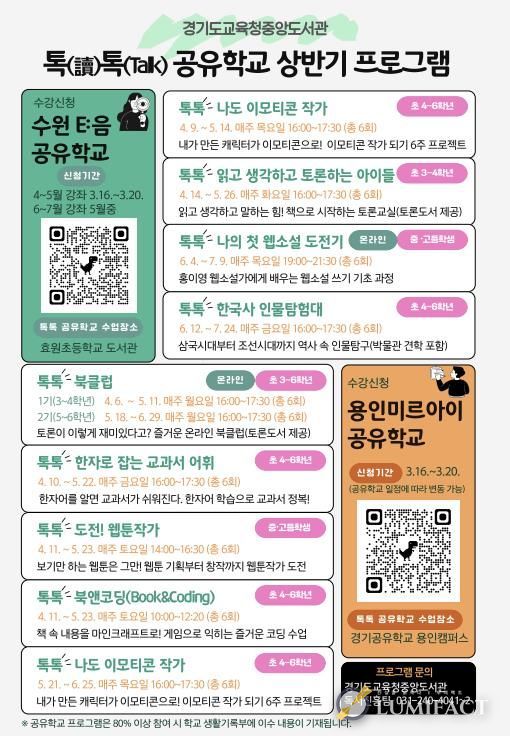 루미팩트 백라희 기자 | 경기도교육청중앙도서관이 학생들의 창의적 사고력과 진로설계 역량을 강화하기 위해 4월부터 7월까지 녪년 상반기 톡(讀)톡(talk) 공유학교’를 운영한다.
