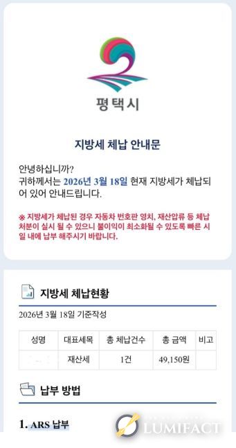 루미팩트 이아린 기자 | 평택시는 ‘모바일 전자고지 시스템’을 활용해 지방세 체납자 1만7천여 명을 대상으로 오는 23일과 24일 이틀 동안 전자문서 형태의 체납안내문을 발송할 예정이다.
