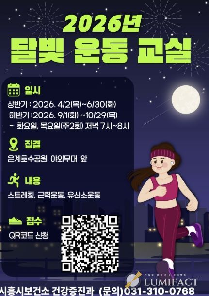 루미팩트 백라희 기자 | 시흥시는 시민들의 건강한 생활습관 형성과 신체활동 증진을 위해 오는 4월 2일부터 은계호수공원 야외무대 앞에서 ‘2026년 달빛 운동 교실’을 운영한다.