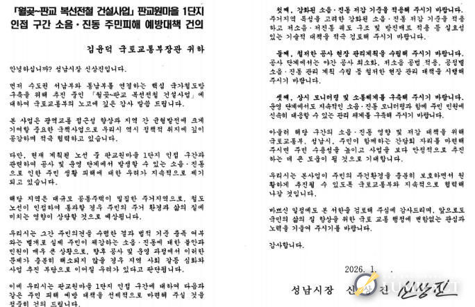 판교원마을 주민 피해 예방을 위해 성남시가 건의한 내용은 △주거지역 특성을 고려한 강화된 소음·진동 저감기준 적용과 저소음·저진동 궤도 구조, 방진매트 설치 등 기술적 대책 검토 △야간 공사 최소화와 저소음 공법 적용 등을 포함한 철저한 공사 현장관리 계획 수립 △운영 단계에서의 상시 소음·진동 모니터링과 주민 소통체계 구축이다.