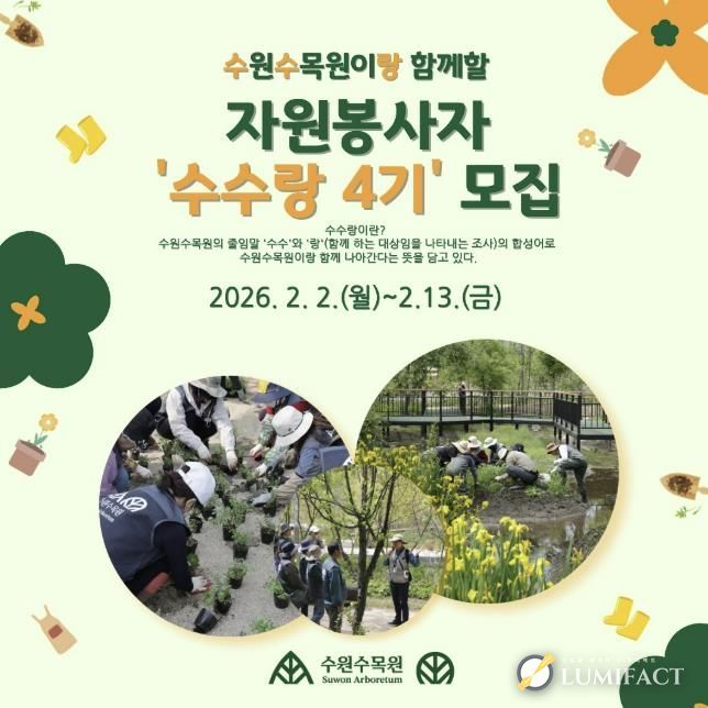 루미팩트 백라희 기자 | 수원특례시는 수원수목원(일월·영흥수목원) 운영을 함께할 자원봉사자 ‘수수랑’ 4기 60명(일반 40명, 해설 20명)을 2월 2일부터 13일까지 모집한다.
