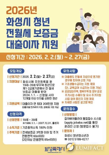 루미팩트 이아린 기자 | 화성특례시(시장 정명근)가 2일부터 오는 27일까지 청년들의 주거비 부담 경감 및 정주 여건 향상을 위해 ‘청년 전·월세 보증금 대출이자 지원사업’ 신청을 받는다.
