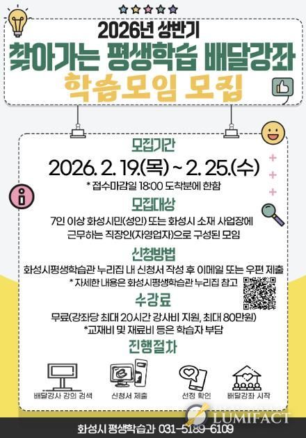 루미팩트 이아린 기자 | 화성특례시는 2월 19일부터 2월 25일까지 2026년 상반기'찾아가는 평생학습 배달강좌'학습모임을 모집한다.