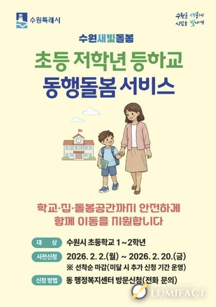 루미팩트 백라희 기자 | 수원특례시가 ‘초등 저학년 등하교 동행돌봄서비스’ 사전 신청 기간을 운영한다.