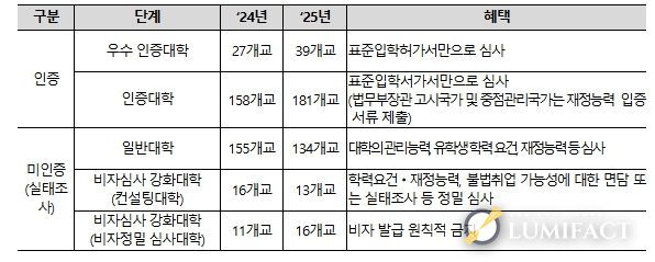 한편, 인증대학 외에 외국인 유학생이 1명 이상 재적 중인 대학에 대해서는 ‘유학생 유치‧관리 실태조사’를 실시하고, 일정 기준을 충족하지 못할 시 비자심사 강화대학(컨설팅대학, 비자정밀 심사대학)으로 지정했다. 이를 통해 대학이 외국인 유학생의 유치 단계에서 어학 능력과 재정 능력 등을 엄격히 심사하도록 하고, 유학생 관리 전반에 대한 대학의 책임을 강화할 예정이다.