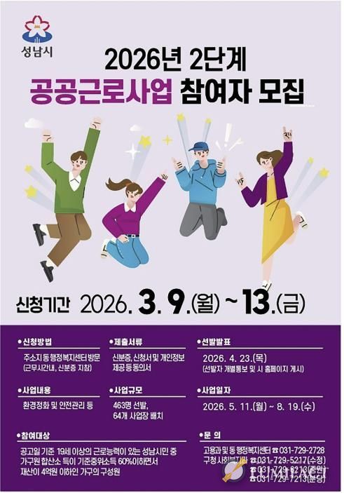 루미팩트 백라희 기자 | 성남시는 오는 3월 9일부터 13일까지 ‘2026년도 2단계 공공근로사업’ 참여 희망자 463명을 모집한다.