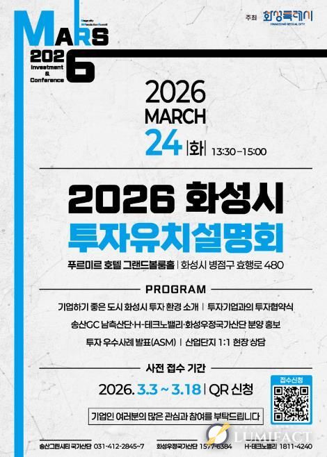 루미팩트 이아린 기자 | 화성특례시가 오는 3월 24일 푸르미르 호텔에서 ‘2026 화성특례시 투자유치 설명회’를 개최하고, 3월 3일부터 3월 18일까지 QR코드를 통한 사전접수를 진행한다.