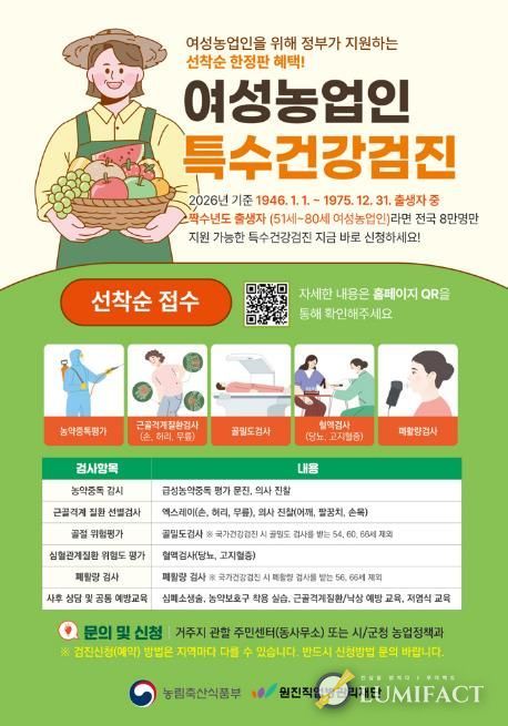 오산시 관계자는 “여성농업인은 농작업과 가사노동을 병행하면서 건강관리에 어려움을 겪는 경우가 많다”며 “이번 특수건강검진 지원사업을 통해 농작업으로 인한 질환을 조기에 발견하고 여성농업인의 건강한 농업활동을 지원하겠다”고 말했다.