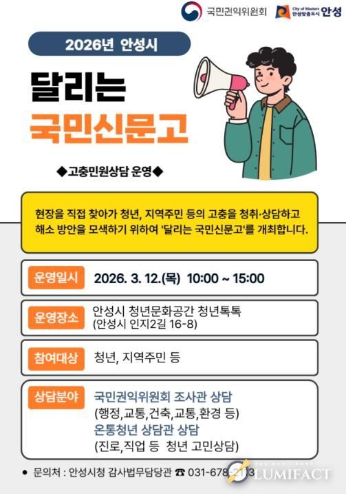 루미팩트 백라희 기자 | 안성시는 오는 12일 오전 10시부터 오후 3시까지 청년문화공간 ‘청년톡톡’(인지2길 16-8)에서 국민권익위원회와 함께 ‘달리는 국민신문고’를 운영한다.