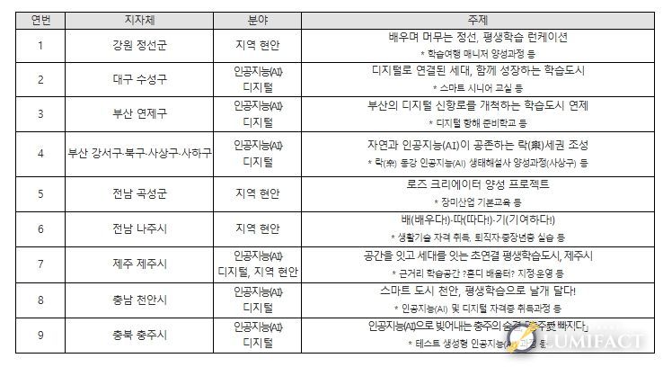 올해 교육부와 국가평생교육진흥원은 인공지능(AI) 대전환 시대 도래, 고령화·인구감소 등의 지역 현안 대응 등에 발맞춰, 기존 평생학습도시 201개(’25년 기준) 중 9개 평생학습도시를 지역의 색깔을 살린 ‘특성화 평생학습도시’로 거듭나도록 지원한다. 이번에 선정된 특성화 평생학습도시는 인공지능(AI)·디지털 학습, 지역 산업 참여, 세대 간 교류, 중장년 인재양성 등에 집중하여 평생교육을 지원할 계획이다.