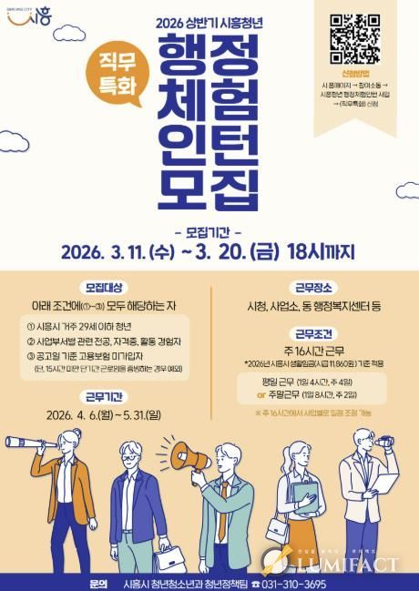 루미팩트 백라희 기자 | 시흥시는 지역 청년들의 실질적인 일 경험과 진로 탐색을 지원하기 위해 ‘2026년 (직무특화) 상반기 행정체험 인턴 사업’을 운영하고, 3월 11일부터 20일까지 참여 청년 10명을 모집한다.