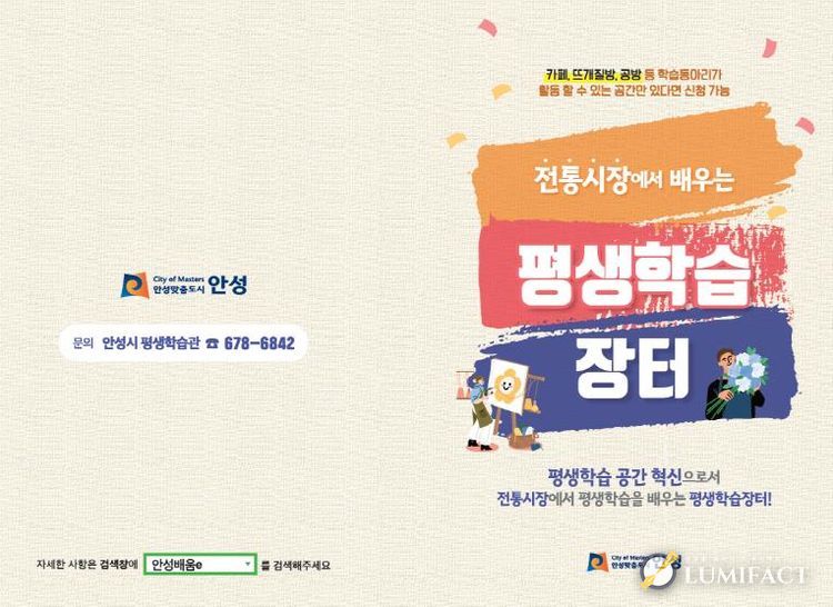 루미팩트 백라희 기자 | 안성시는 오는 3월 23일부터 전통시장 내 유휴공간을 평생학습 공간으로 조성하는 ‘평생학습장터’ 학습공간과 지정 된 공간에서 평생교육 프로그램을 운영할 학습동아리를 모집한다.