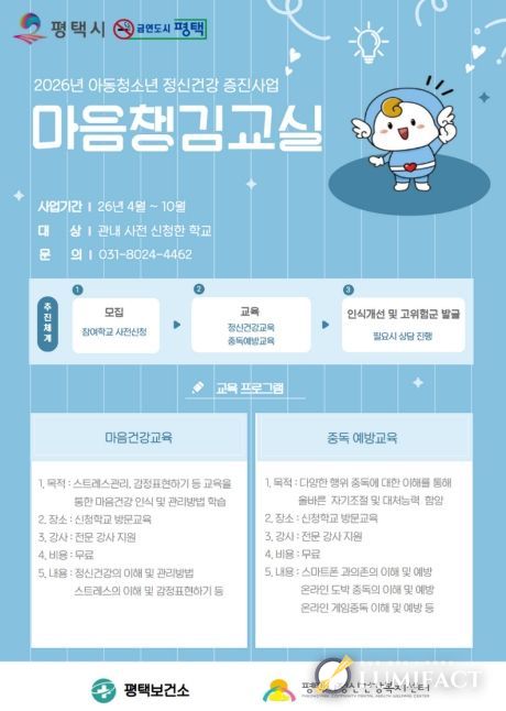 루미팩트 이아린 기자 | 평택시는 스쿨케어 사업의 일환으로 관내 학교 학생들을 대상으로 『마음챙김교실』을 운영한다고 밝혔다. 이번 프로그램은 학생들이 교육을 통해 정신건강을 올바르게 인식하고 스스로 관리할 수 있도록 지원함으로써 마음 건강 증진을 도모하는 데 목적이 있다.