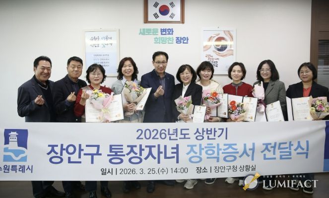 루미팩트 백라희 기자 | 수원시 장안구는 지난 25일, 지역 사회 발전을 위해 행정 최일선에서 헌신하고 있는 통장들의 노고를 격려하기 위해 ‘2026년 상반기 통장자녀 장학증서 전달식’을 개최했다고 밝혔다.