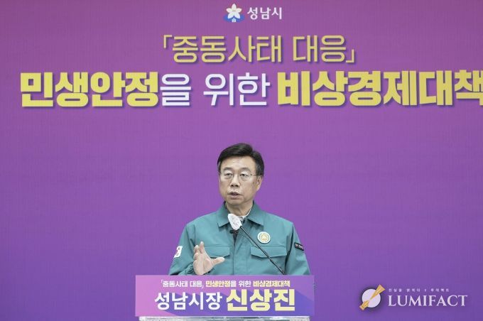 신상진 성남시장은 이날 오전 11시 시청 모란관에서 중동사태 대응 민생안정을 위한 비상경제 대책 기자회견을 열고 “중동 사태로 인한 서민 경제 부담을 완화하고, 지방정부가 앞장서 지원에 나설 수 있도록 중앙정부가 역할을 다해주기를 바란다”며 국가 재난 선포 필요성을 강조했다.