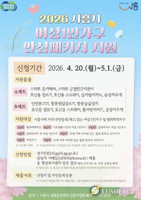 루미팩트 백라희 기자 | 시흥시는 관내 여성 1인 가구 등의 안전한 일상 보호를 위해 ‘2026년 시흥시 여성 1인 가구 안심패키지 지원사업’을 추진하고, 오는 4월 20일부터 5월 1일까지 신청을 받는다.