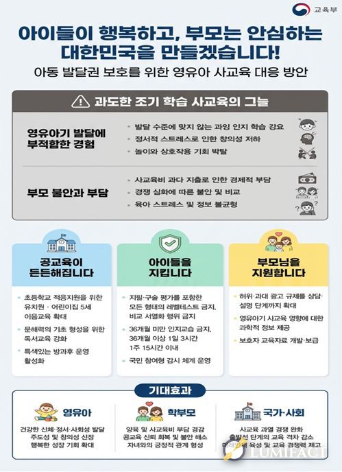 루미팩트 백라희 기자 | 교육부)는 4월 1일‘아동 발달권 보호를 위한 영유아 사교육 대응 방안’을 발표한다. 이는 ‘4세·7세 고시’ 현상 등 비정상적으로 확장된 영유아 사교육 시장을 바로잡고, 과도한 조기 경쟁과 선행 학습으로 인한 발달 저해, 정서적 부담 가중 등 아동학대적 양상까지 나타나는 상황에 대응하기 위해서이다.