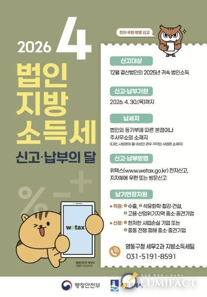 루미팩트 백라희 기자 | 수원시 영통구는 4월 1일부터 30일까지 법인지방소득세 확정신고 기간을 맞아 관내 7,500여 개 법인과 세무대리인을 대상으로 신고 안내를 강화했다. 기한 내 원활한 신고·납부를 돕기 위해 대상 법인과 세무대리인에게 안내문도 발송했다.