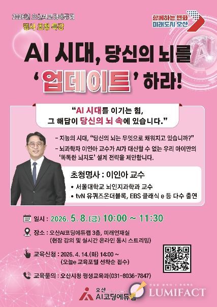 루미팩트 이아린 기자 | 오산시는 오는 5월 8일 오전 10시 오산AI코딩에듀랩에서 『AI시대, 당신의 뇌를 ‘업데이트’하라!』를 주제로 명사 초청 디지털 AI 시민 특강을 개최한다고 밝혔다.