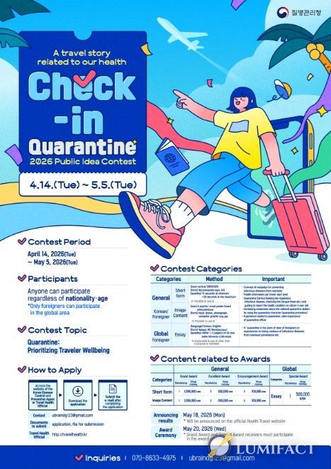 루미팩트 백라희 기자 | 질병관리청은 건강한 해외여행 문화를 확산하고 여행자 건강 중심 검역에 대한 국민 인식을 높이기 위해 4월 14일부터 5월 5일까지 '체크인, 검역 : 우리가 만드는 여행건강 이야기, 국민 생각 공모전'을 개최한다.