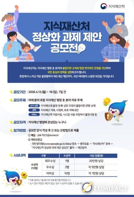 루미팩트 백라희 기자 | 지식재산처는 지식재산 행정 전반에 남아있는 비정상적인 관행과 불합리한 제도를 발굴하고 이를 개선하기 위해 전 국민을 대상으로 '지식재산처 정상화 과제 제안 공모전'을 실시한다고 밝혔다.