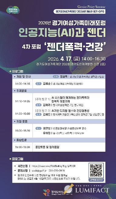 루미팩트 백라희 기자 | 경기도여성가족재단은 오는 17일 재단 회의실에서 ‘인공지능과 젠더폭력·건강’을 주제로 4차 경기여성가족미래포럼을 개최한다. 3월부터 5월까지 총 5차례 진행하는 경기여성가족미래포럼 중 이번이 4회차다.