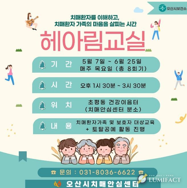 루미팩트 이아린 기자 | 오산시치매안심센터는 치매 환자와 가족의 정서적 부담을 완화하고 돌봄 역량 강화를 지원하기 위해 치매 가족 대상 프로그램 '헤아림 교실' 2기 참여자를 모집한다고 밝혔다.