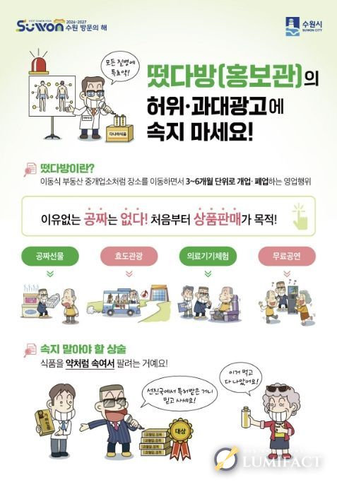 루미팩트 백라희 기자 | 수원특례시가 15일부터 관내 경로당을 중심으로 ‘떴다방(홍보관)’ 피해 예방 방법을 홍보하고, 떴다방을 점검한다.