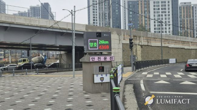 과속 감지 센서와 카메라를 통해 차량 속도와 번호판을 인식하고, 전광판에 주행 속도와 과속 여부, 차량번호 일부를 표시해 운전자의 자발적인 감속을 유도한다.