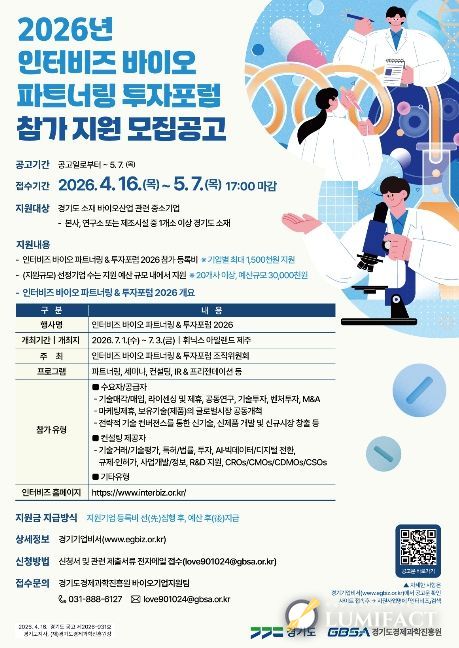 루미팩트 백라희 기자 | 경기도는 (재)경기도경제과학진흥원과 함께 도내 바이오·제약 기업의 기술사업화와 투자 활성화를 지원하기 위해 ‘인터비즈 바이오 파트너링&투자포럼 2026’에 참가할 기업을 모집한다.