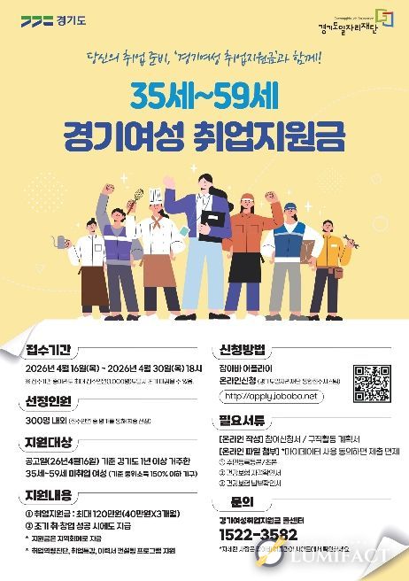 루미팩트 백라희 기자 | 경기도가 경력보유여성 등 도내 35~59세 미취업 여성의 취업을 돕기 위해 ‘2026년 경기여성 취업지원금’ 참여자 300명을 오는 30일까지 모집한다.