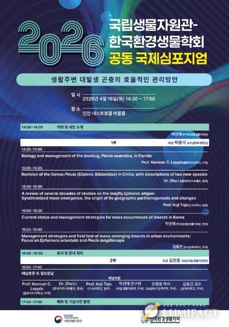 루미팩트 백라희 기자 | 기후에너지환경부 소속 국립생물자원관은 환경생물학회와 공동으로 4월 16일 오후 네스트호텔(인천시 영종도 소재)에서 ‘생활주변 대발생 곤충의 효율적인 관리방안’이라는 주제로 국제학술토론회(심포지엄)를 개최한다고 밝혔다.