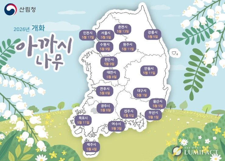 루미팩트 백라희 기자 | 산림청 국립산림과학원은 봄기운이 완연해지는 시기를 맞아 4~5월에 꽃을 피우는 주요 밀원수종인 아까시나무와 마가목의 ‘봄철 꽃나무 개화 시기 예측 지도’를 발표했다.