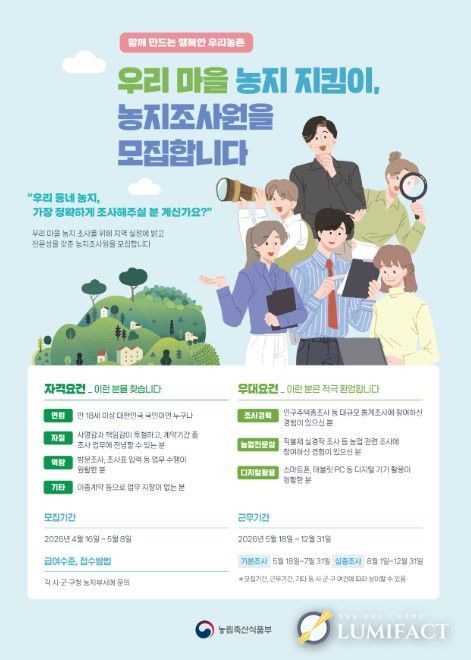 루미팩트 백라희 기자 | 농림축산식품부는 4월 16일부터 5월 8일까지 농지 전수조사 조사원을 모집한다.